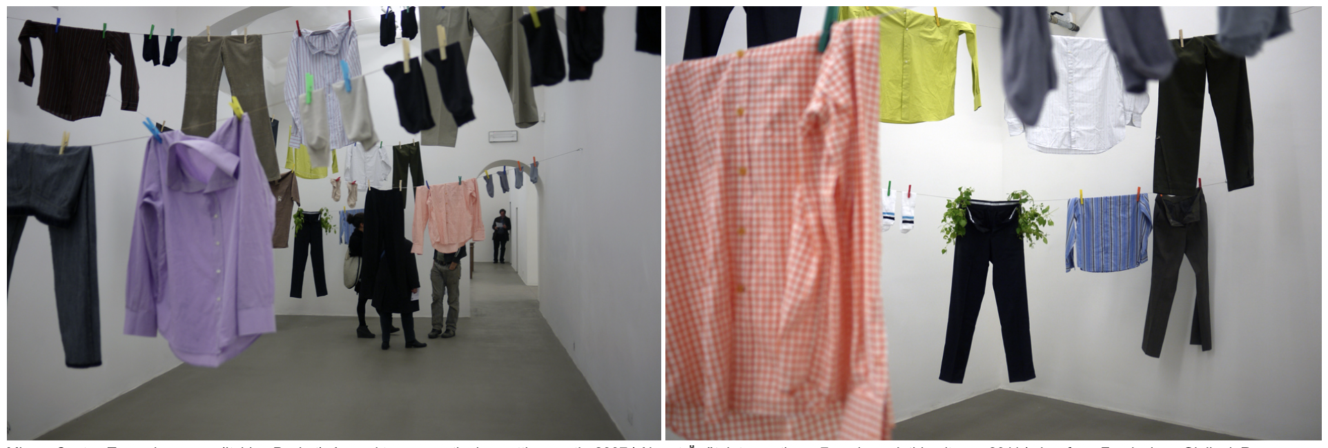 Mircea Cantor, Tascache punge (Itching Pocket); Armani trousers, stinging nettles, earth, 2007 | Ahmet Ögüt, intervention n.7: various clothing items, 2011 | view from Fondazione Giuliani, Rome