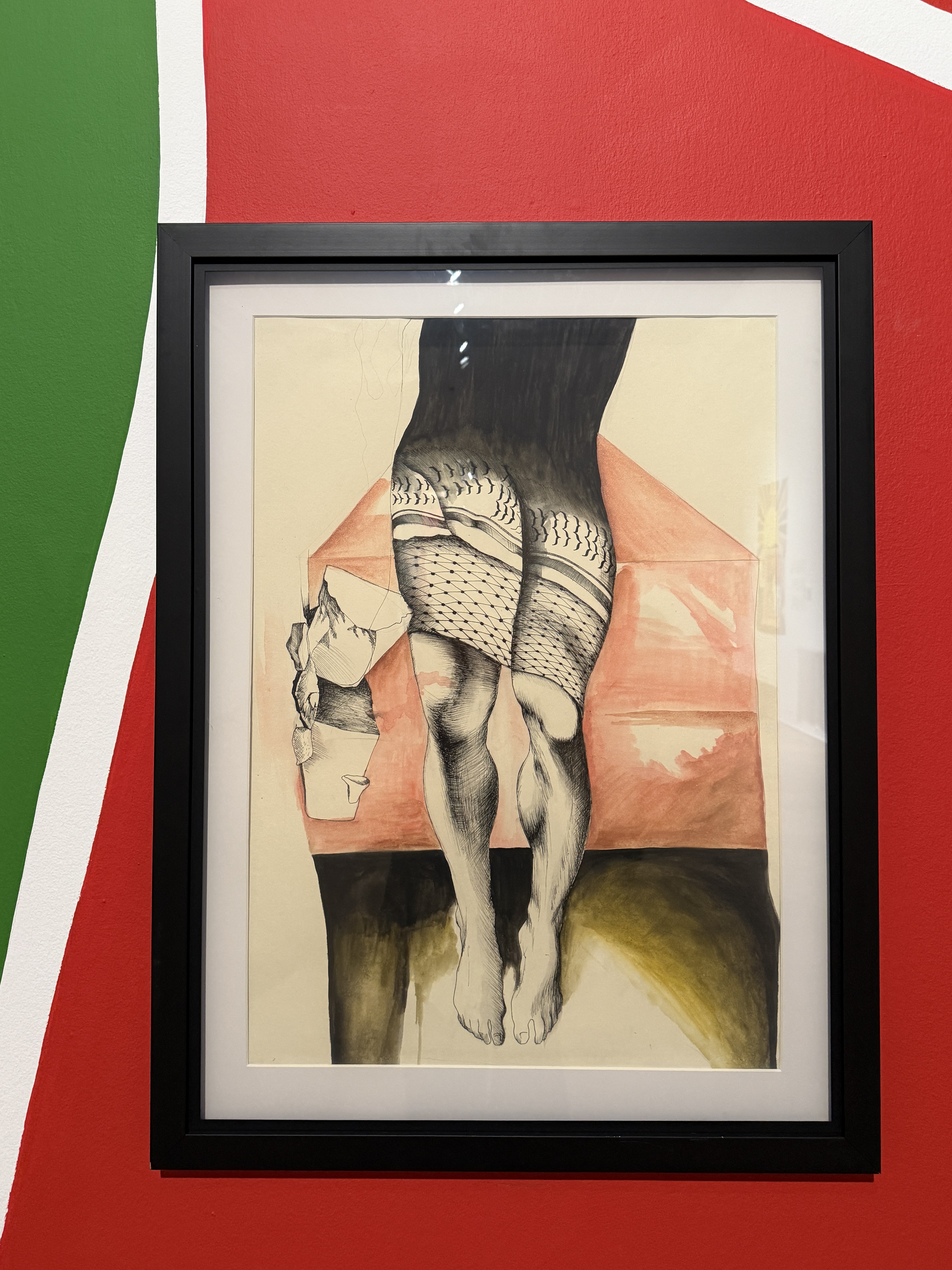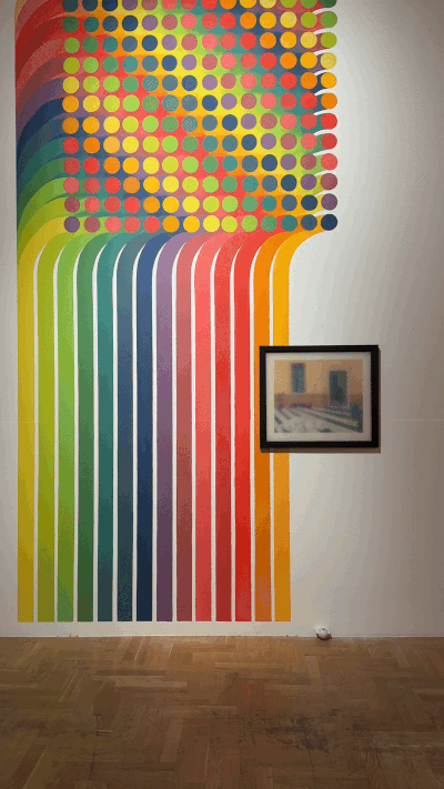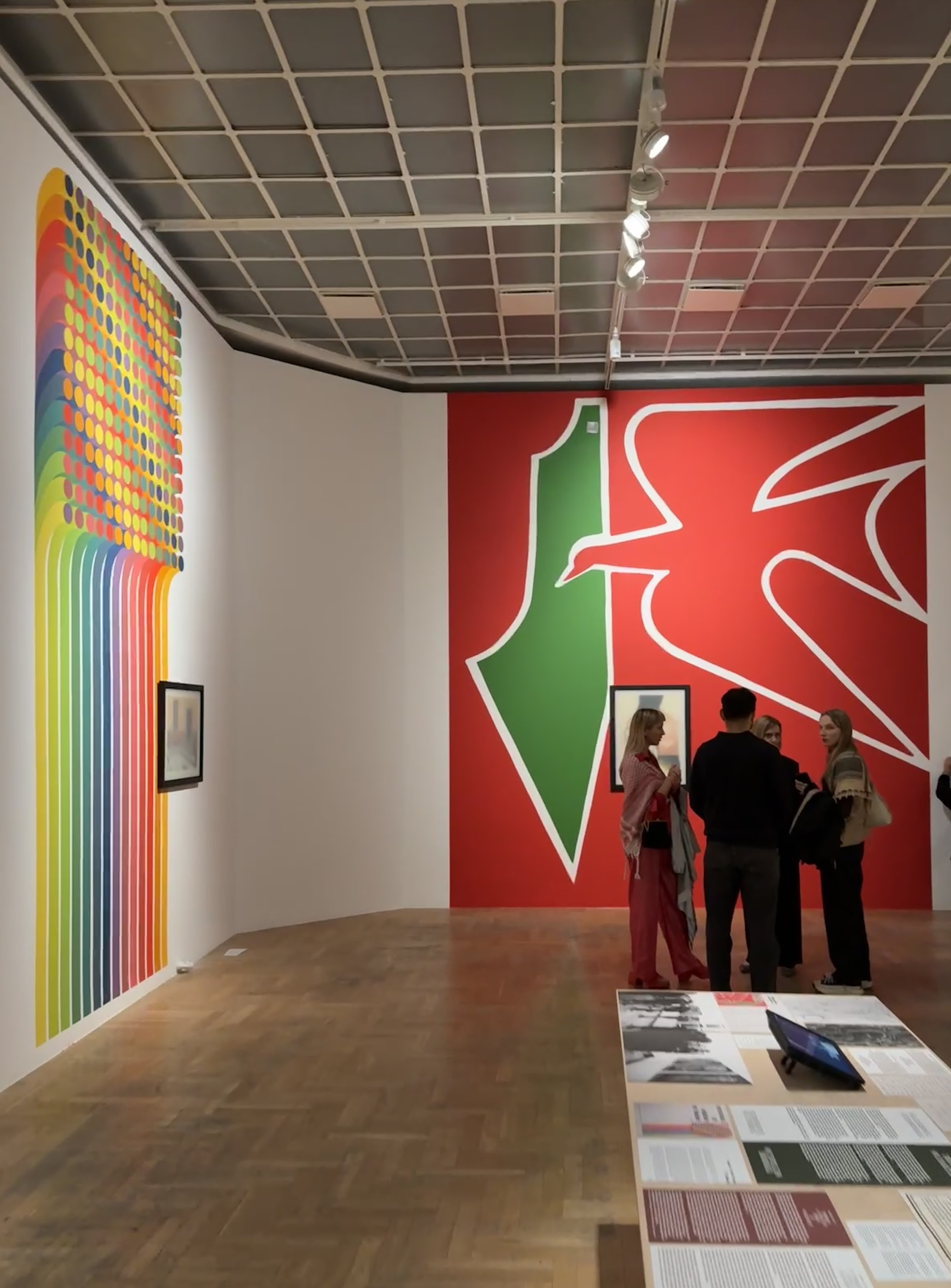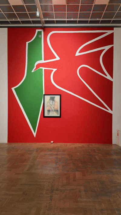 At Zachęta, these replicas become visible only when viewers stand directly in front of them, behind panes of magic glass. Safe Return of the Destroyed (with replica of Janet Venn Brown’s painting, 1972) and Safe Return of the Disappeared (with replica of Hosni Radwan’s In Memory of Palestine, 1980) are shown against two large murals inspired by the visual designs of the original 1978 and 1980 exhibitions.