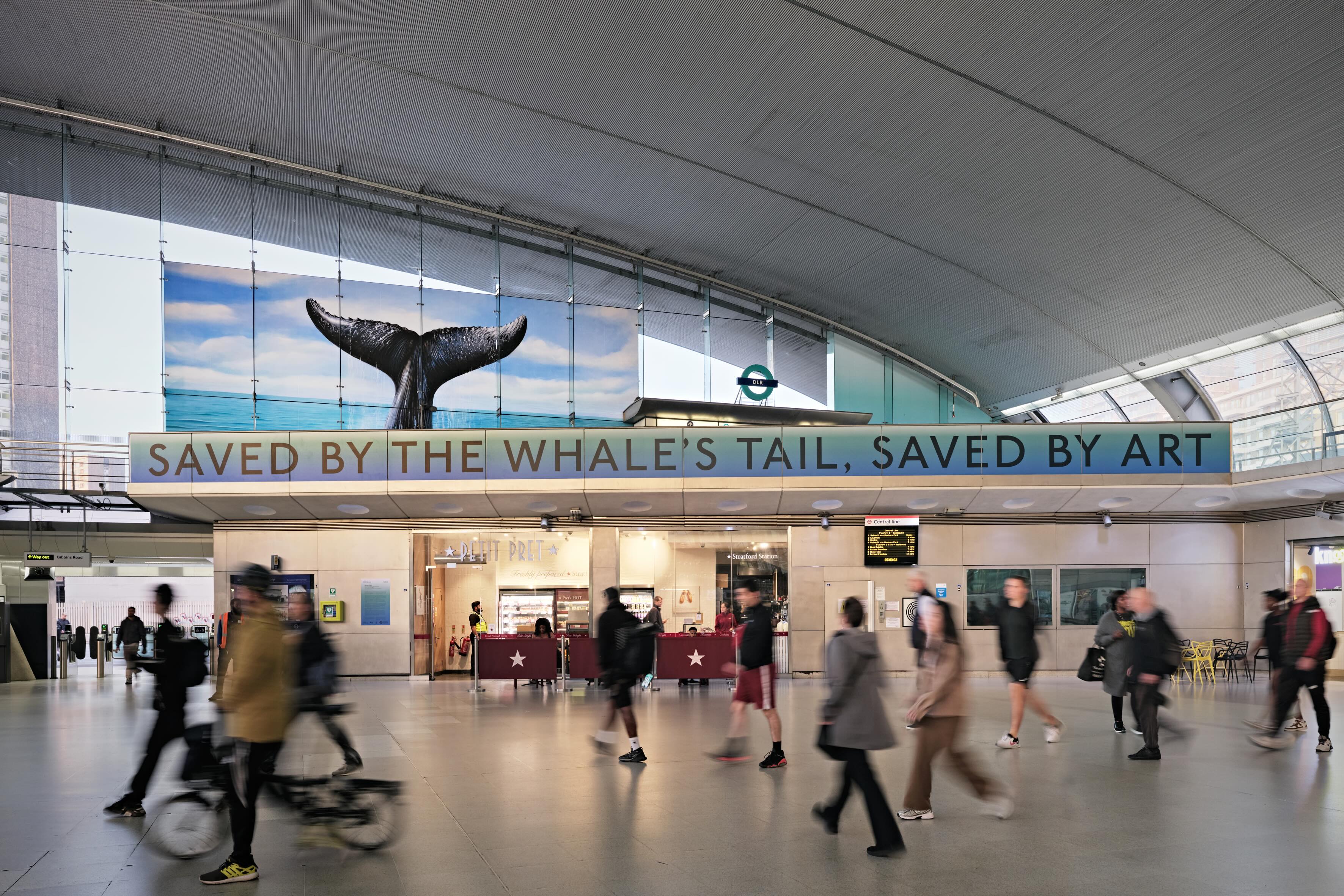 “Saved by the Whale’s Tail, Saved by Art” is a large-scale artwork in London commissioned by Art on the Underground in collaboration with New Contemporaries. It’s inspired by an incident that occurred in 2020 when a train on the Rotterdam Metro overran the stop blocks at a station located on an elevated metro line. A carriage, at risk of falling into the water beneath, was ‘saved’ by a 10-metre high public art sculpture of a whale’s tail, which prevented its fall. Taking this as a base story, the campaign initiatied the following questions to the public; Can art save lives? Have you witnessed art saving a life?