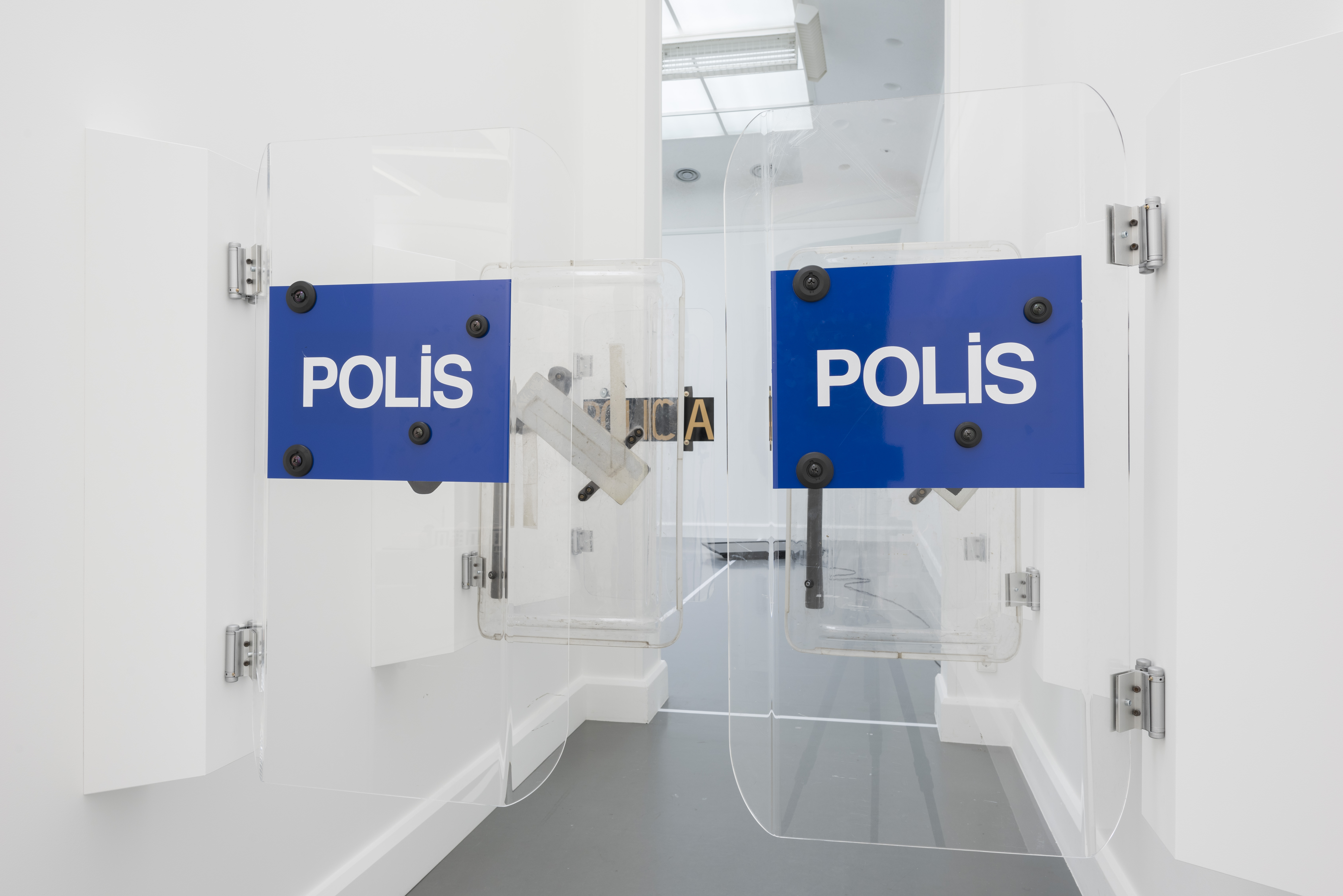 | A swinging door made of two original riot shields. The shields, typically used by police to block protesters during demonstrations, here become doors that physically join two rooms. This intervention subverts the original function of the object and thus activates direct relation between the viewer and the work: the viewers ‘force’ this device into a method of passage rather than inhibition and in doing so compute an action of resistance. |
